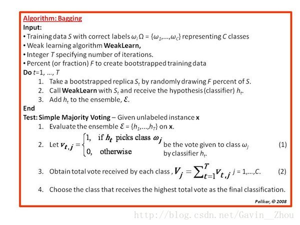 Bagging=Bootstrap Aggregating,是model averaging的策略. bootstrap是一种有放回的抽样,那么bagging就是使用bootstrap抽样来进行模型平均(vote). 从训练集从进行子抽样组成每个基模型所需要的子训练集,对所有基模型预测的结果进行综合产生最终的预测结果.