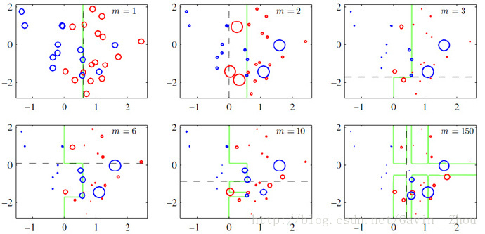 其中绿色的线表示目前取得的模型(模型是由前m次得到的模型合并得到的),虚线表示当前这次模型。每次分类的时候,会更关注分错的数据,上图中,红色和蓝色的点就是数据,点越大表示权重越高. 当m=150的时候,模型已经可以将数据正确的分来.