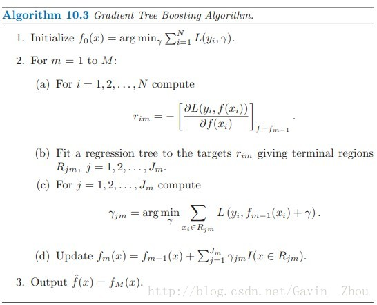 2(a)表示计算损失函数的负梯度在当前模型的值,将其作为残差的估计值; 2(b)表示估计回归树叶子节点的区域,以拟合残差的近似值; 2(c)表示利用线性搜索估计叶子节点区域的值,使得损失函数最小化; 2(d)更新回归树;