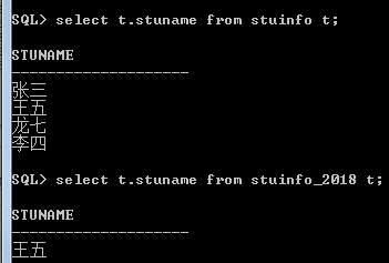 已知表stuinfo中有张三丰,没有龙五和李一天;表stuinfo_2018中有龙五和李一天,但没有张三丰。