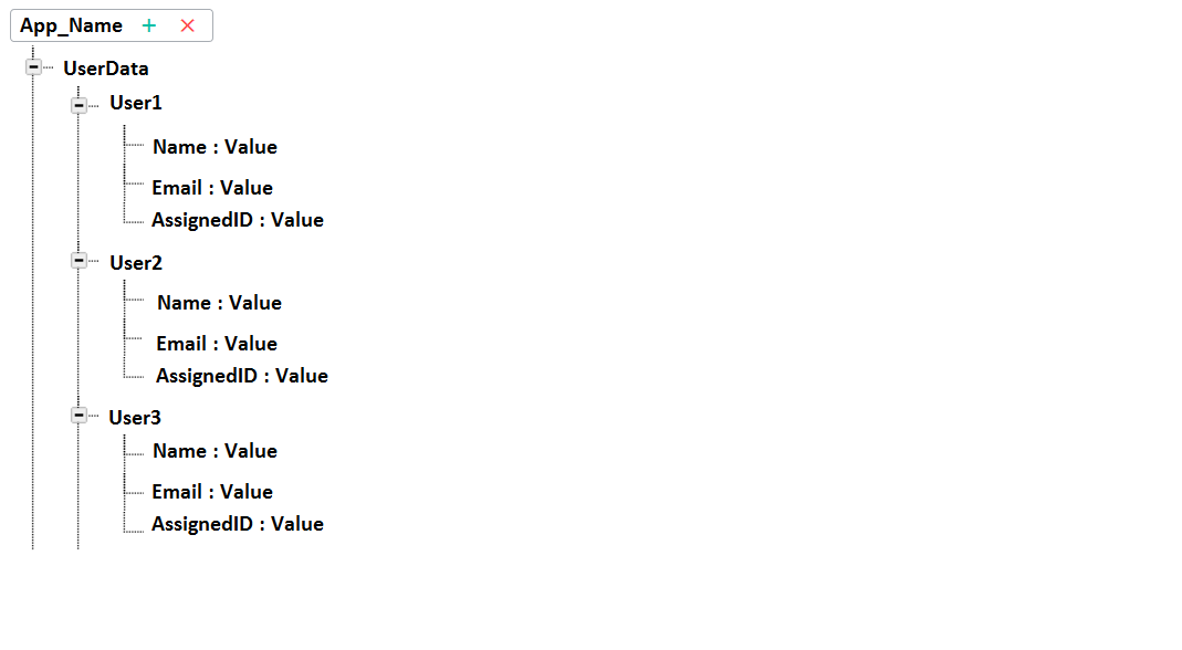 From the available nodes, UserData is the one that holds the name, email, assigned-id
