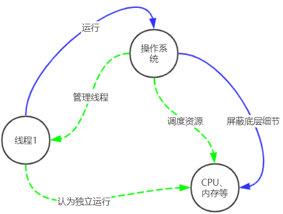 站在线程的角度,设计者对于线程的作用就是声明了线程的功能,即给这个线程指派了任务。但是这个线程具体如何执行,如何完成这些任务,就需要操作系统的管理。