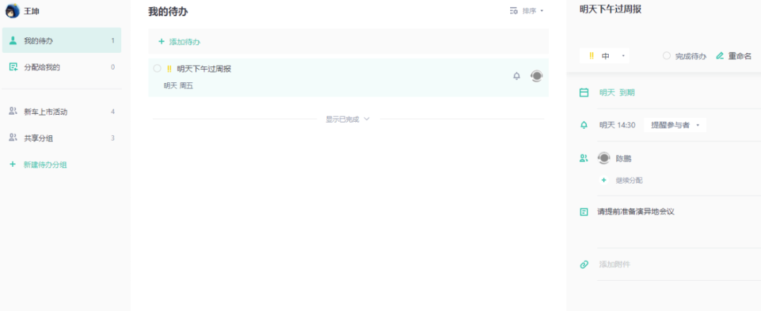 使用金山待办,与自己小组的成员创建「共享任务分组」,在组内创建完需要处理的任务后,可快速分配给各组员。