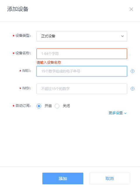 进入开发者中心->NB-IoT物联网套件->添加产品->添加设备(IMEI号)