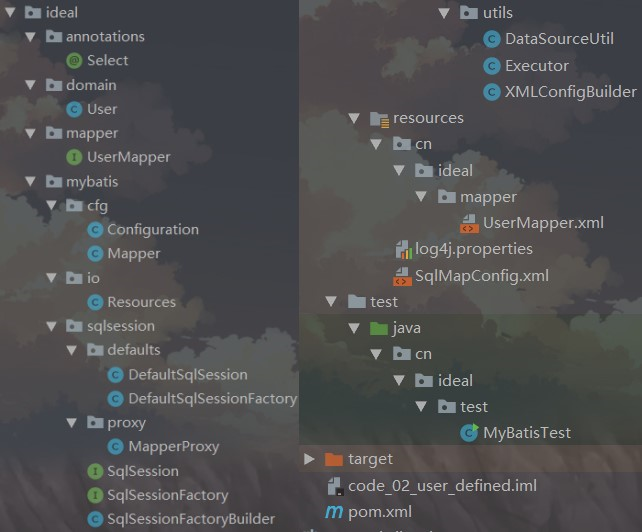 - MyBatis 相关的配置文件,例中的 SqlMapConfig.xml 被 Rosource 类中的方法读取,得到一个流文件