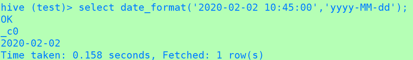 select date_format('2020-02-02 10:45:00','yyyy-MM-dd');