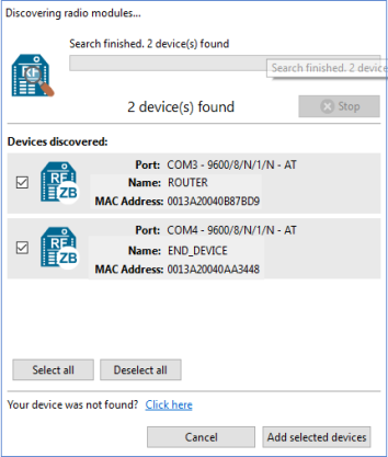 - XCTU定位无线电模块时,它们将显示在“ 发现无线电模块 ...”对话框中。发现过程完成后,点击添加所选设备。