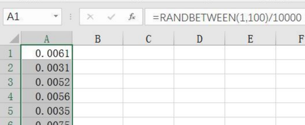 第二步:输入公式“=RANDBETWEEN(1,100)/10000”,然后按“Ctrl + Enter”组合键结束,这时候通过RANDBETWEEN(1,100)就生成了1-100之间的随机数,然后除以10000,就得到0-0.01之间的随机数了(如下图):