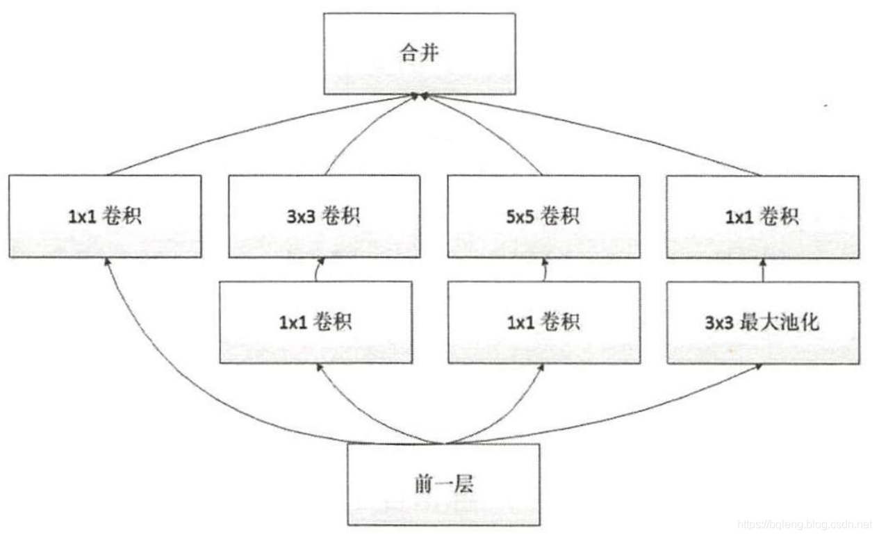 下面就是googlenet中用的inception结构, 最常用的卷积核是3*3和5*5,那么这里的1*1其实用途是特征图通道的增加和减少。