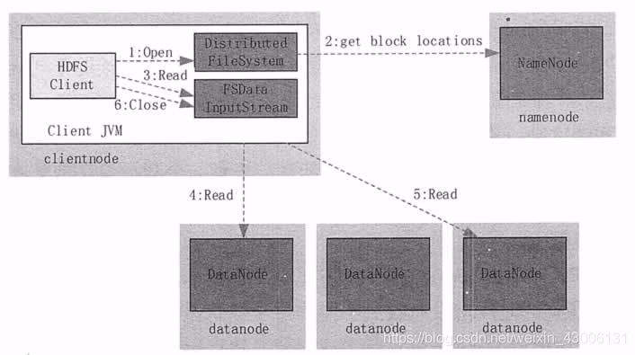 5) FSInputStream连接保存此文件下一个数据块的最近的 DataNode,并读取数据。