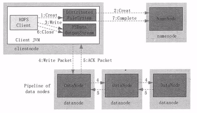 7) 调用 FSOutputStream 的 Close() 方法,将所有的数据块写入数据流管道中的数据结点,并等待确认返回成功。最后通过 NameNode 完成写入。