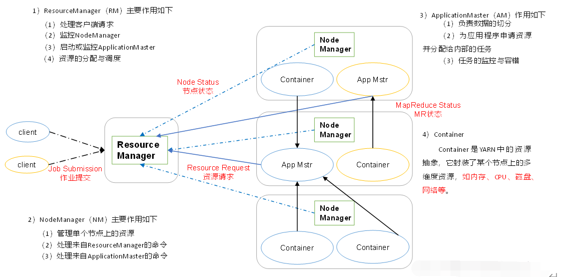 YARN主要由ResourceManager、NodeManager、ApplicationMaster和Container等组件构成
