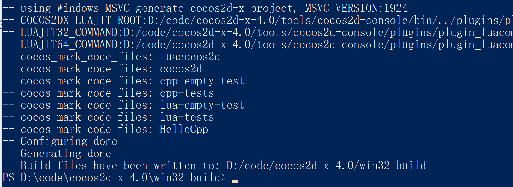 cocos2d-x-4.0升级有点大,我没找到python脚本构建项目的方法。结合官方文档和网友们的经验,使用cmake成功构建了项目(首先你的机器要装cmake)。步骤如下: