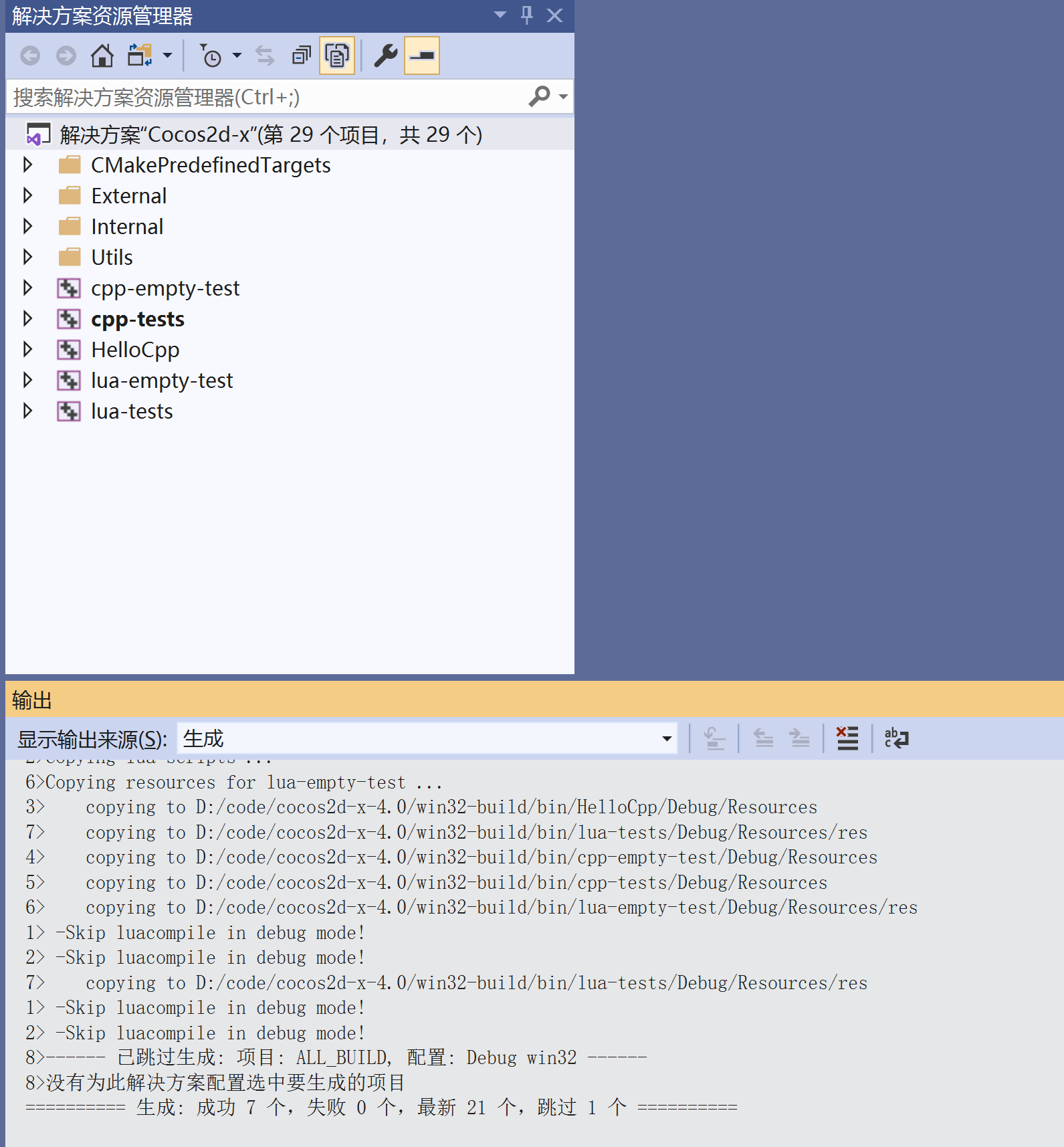 打开Cocos2d-x.sln,编译没有提示错误,编译成功了。