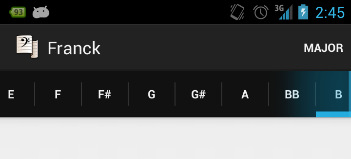 As expected, I get a horizontall scrolling list of tabs under my action bar. In the screenshot below, you can see that the last tab (B, on the right) is noticably smaller than the other tabs (don't take the "E" tab into account, it can be scrolled as there are 4 more tabs on the left).
