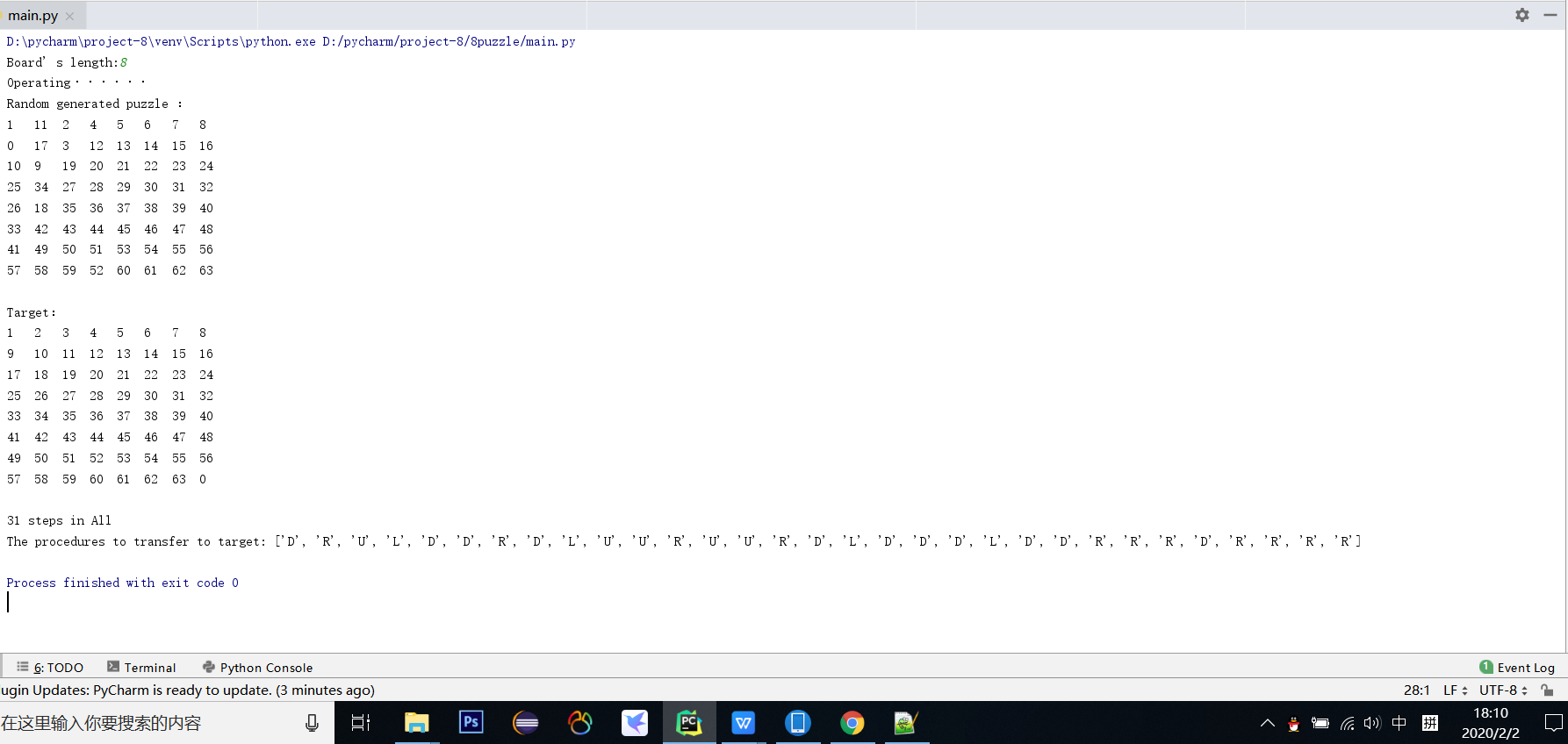 8益智游戏-开发并编码一个算法来解决8益智游戏。你可能想用A*算法来解决这个问题。迷宫应该是随机的,程序应该显示出解决这个难题的每一步。你的程序应该可以在任何大小的板上工作。您必须显示至少两个正在解决的谜题,一个用于8×8,一个用于10×10。
