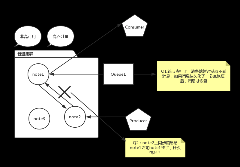 为什么设置镜像模式集群,因为队列的内容仅仅存在某一个节点上面,不会存在所有节点上面,所有节点仅仅存放消息结构和元数据。下面自己画了一张图介绍普通集群丢失消息情况: