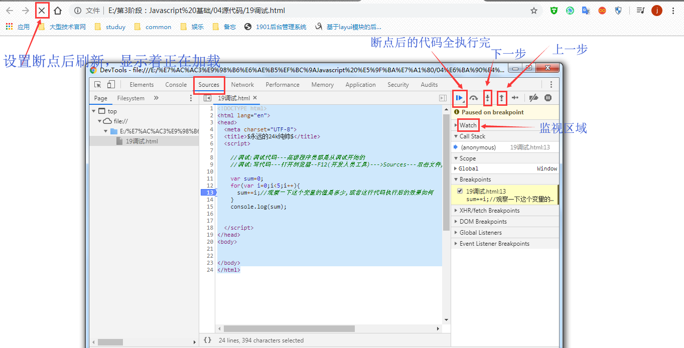 浏览器中按F12-->sources-->找到需要调试的文件-->在程序的某一行设置断点