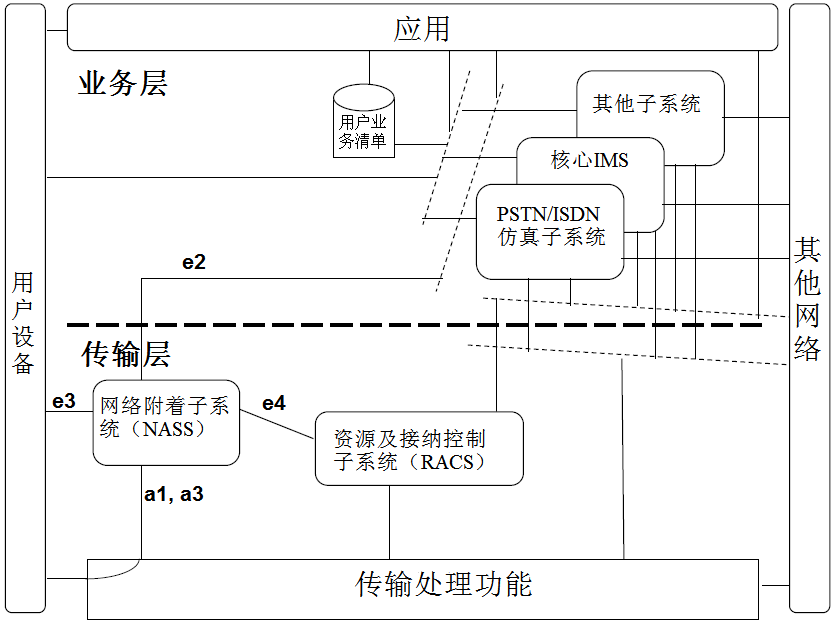 TISPAN依据3GPP的IP多媒体子系统(IMS)体系架构提出了NGN的体系结构和逻辑功能结构,并尽可能重用3GPP的相关规范,但要求支持更多的接入方式,包括数字用户线(xDSL)、局域网(LAN)、无线局域网(WLAN)、WiMAX等。目的是使IMS成为基于会话初始协议(SIP)的通用平台,同时支持固定通信网和移动通信网的多种接入方式。TISPAN因此在传送层引入了网络附着子系统(NASS)与资源及接纳控制子系统(RACS),负责为上层业务层提供独立的用户接入管理功能。