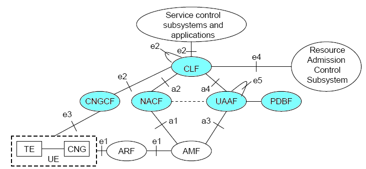 - CNG配置功能(CNGCF-CNG(Customer Network Gateway) Configuration Function):CNGCF用于CNG的初始化以及对CNG的升级。CNGCF向CNG提供附加的配置信息(如:CNG内部防火墙的配置、IP包的QoS整形、等等),CNGCF所提供的数据不同于NACF所提供的网络配置数据。