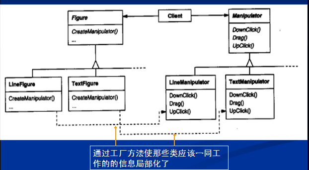 利用工厂方法可以连接平行的类层次。当一个类将它的一些职责委托给一个独立的类的时候,就产生了平行类层次(如下图)