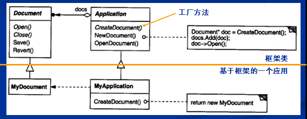 如图中所示,Application的子类重定义Application的抽象操作CreateDocument以返回适当的Document子类对象,一旦一个Application子类实例化后,它就可以实例化与应用相关的文档,而无需知道这些文档的类,我们称CreateDocument是一个工厂方法,因为它负责“生产一个对象”。