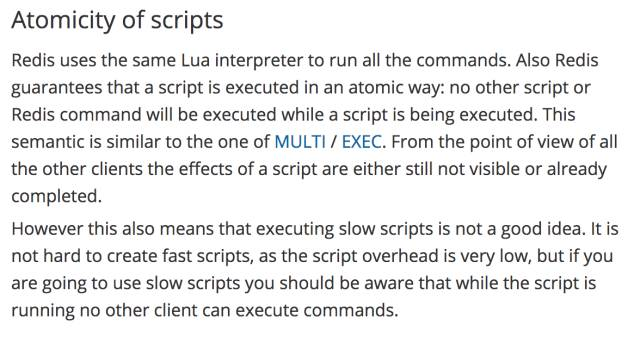 那么这段Lua代码的功能是什么呢?其实很简单,首先获取锁对应的value值,检查是否与requestId相等,如果相等则删除锁(解锁)。那么为什么要使用Lua语言来实现呢?因为要确保上述操作是原子性的。那么为什么执行eval()方法可以确保原子性,源于Redis的特性,下面是官网对eval命令的部分解释: