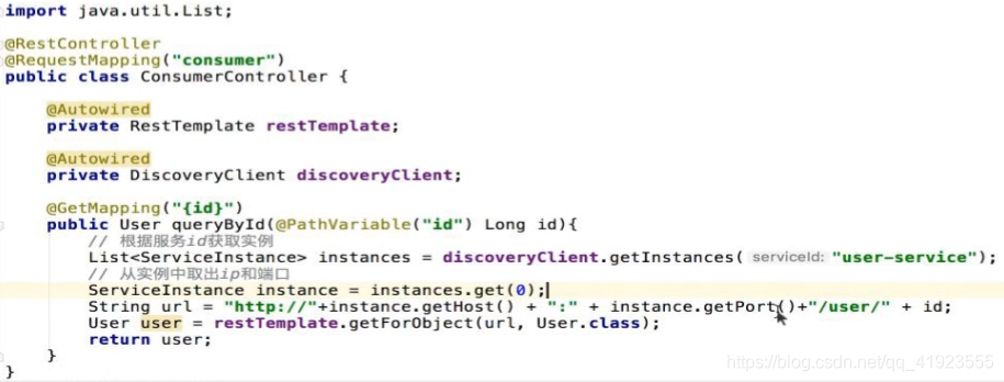 注入DiscoveryClient,根据服务id获取实例,从实例中获取ip与端口