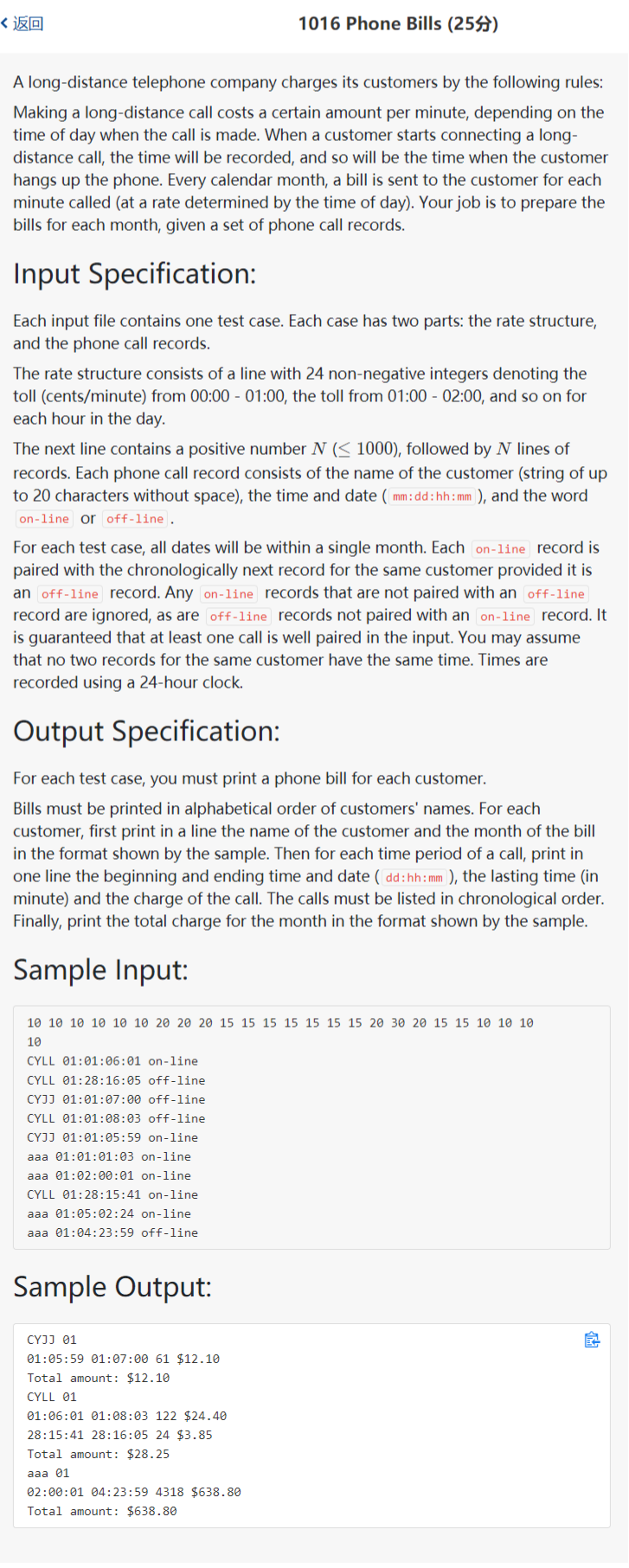 //1016 Phone Bills (25分) https://pintia.cn/problem-sets/994805342720868352/problems/994805493648703488