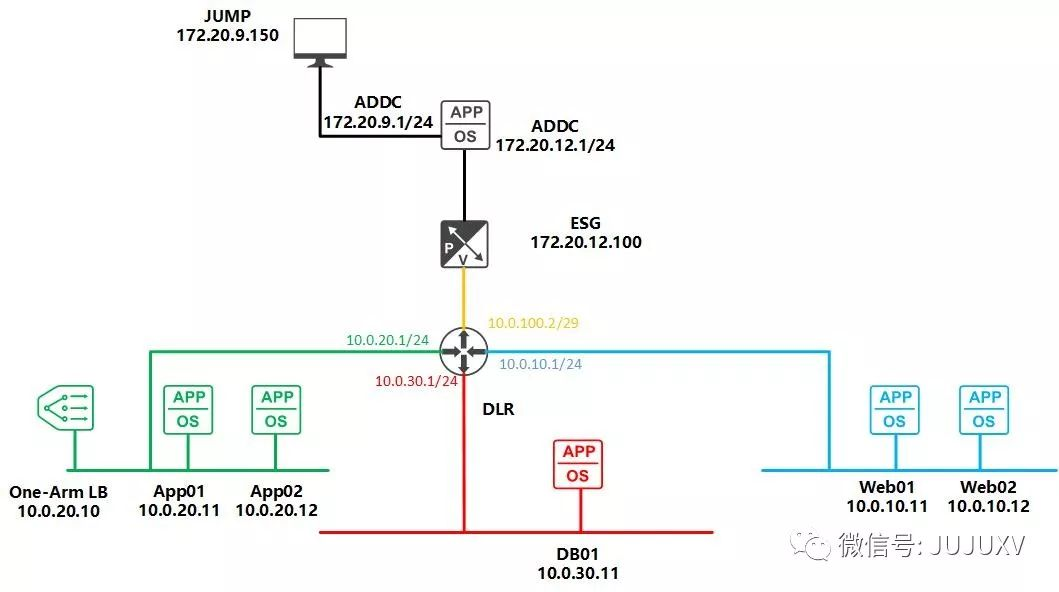 通过下图,各位可以看到逻辑网络与物理网络之间的边界是ESG设备;我们需要在ADDC、ESG和DLR上配置路由条目,才能实现今天讨论的目标。
