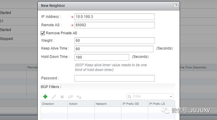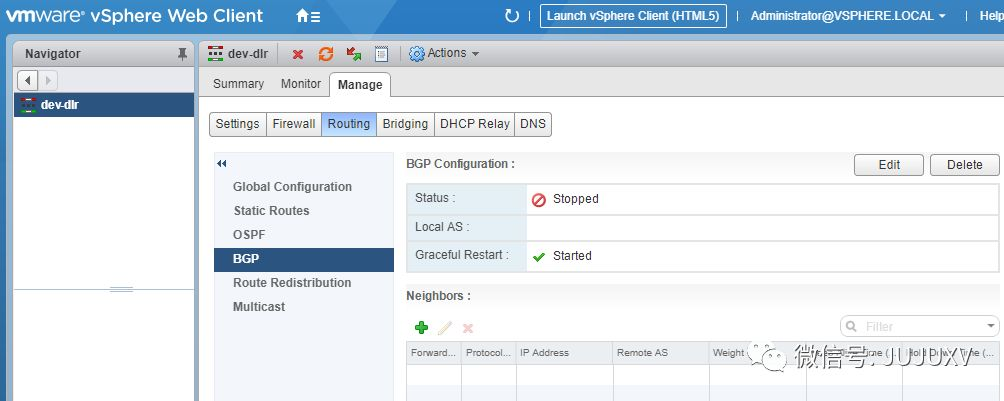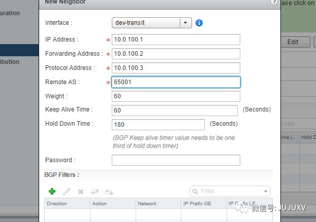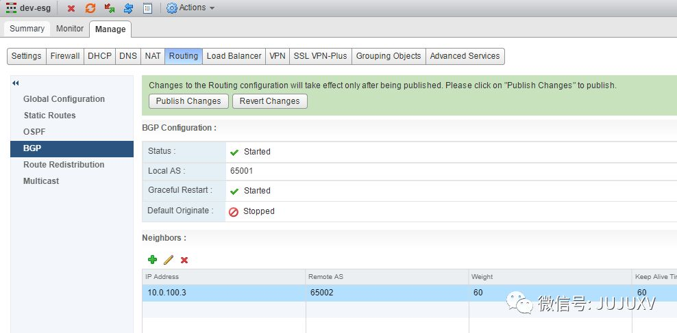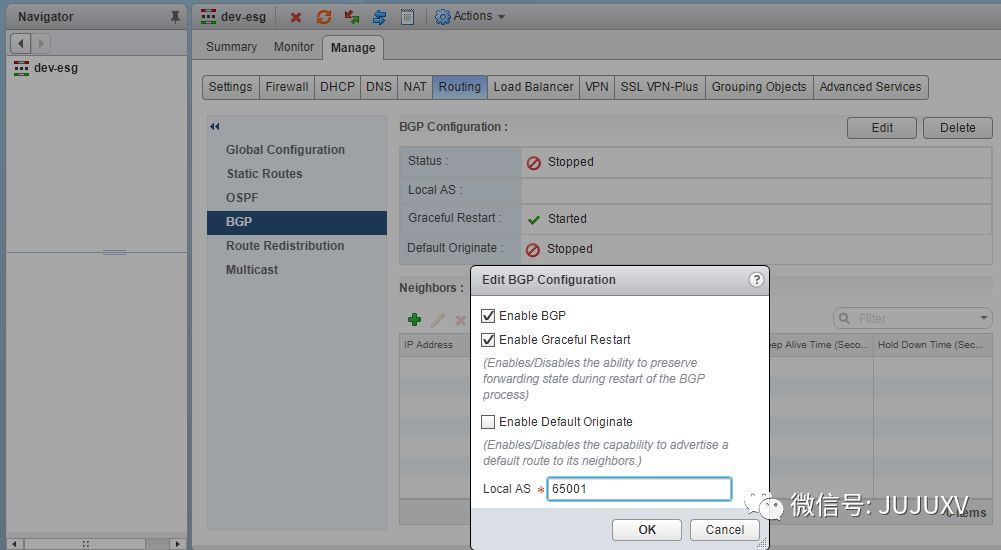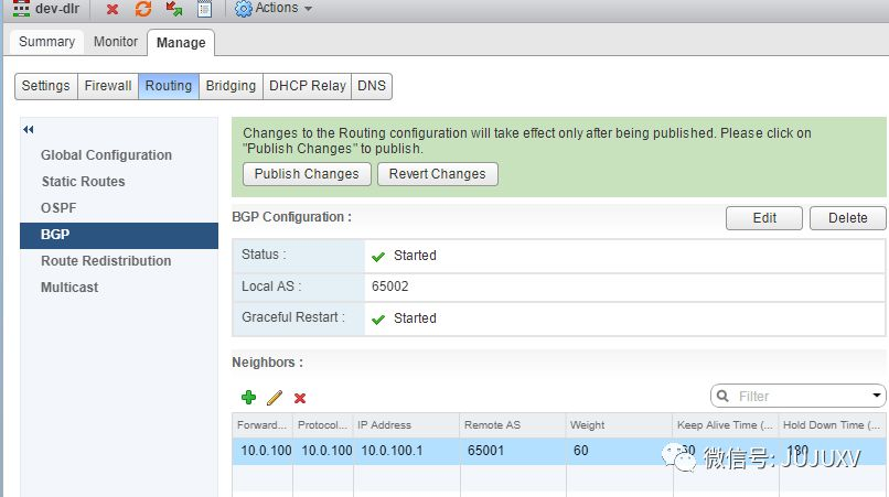 添加dev-esg作为dev-dlr的邻居,地址为10.0.100.1,远端自治系统65001