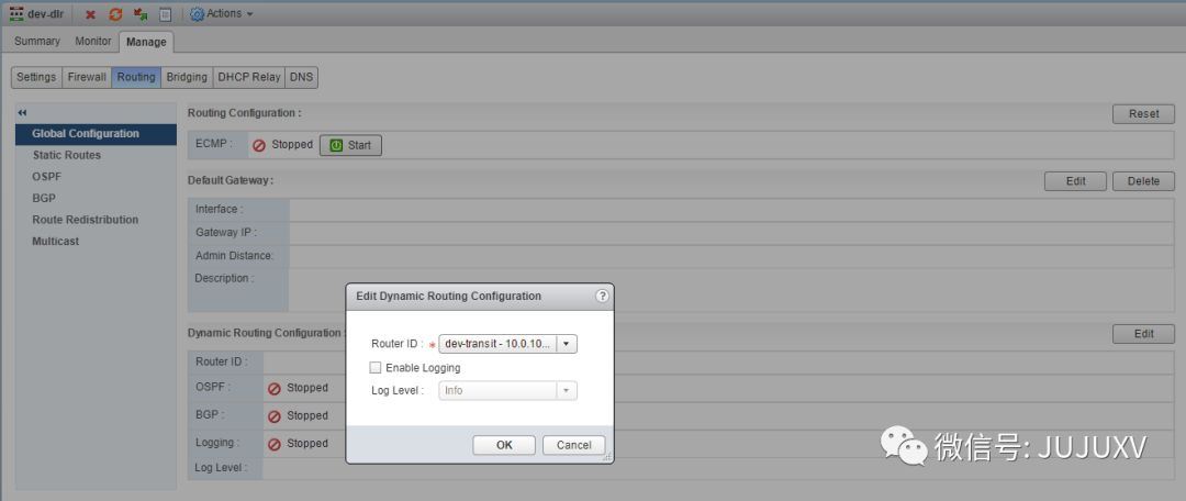 首先开始配置dev-dlr,在Routing路由设置下,找到Global Configuration全局设置,点击Dynamic Routing Configuration旁的Edit编辑按键,声明dev-dlr设备的Router ID