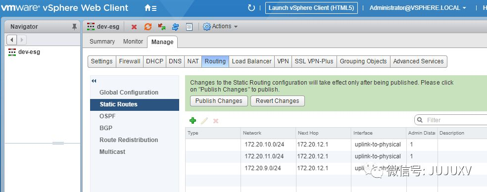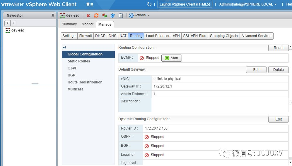 通过在ADDC上配置静态路由,外部网络已经了解到所有逻辑网络目标的下一跳地址是ESG的上联地址,即172.20.12.100/24;接下来,我将演示,如何配置dev-dlr与dev-esg之间的动态路由,最终实现迷你SDDC网络架构拓扑。