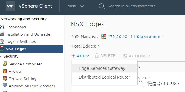 在NSX Edges页面,点击ADD,添加Edge Services Gateway