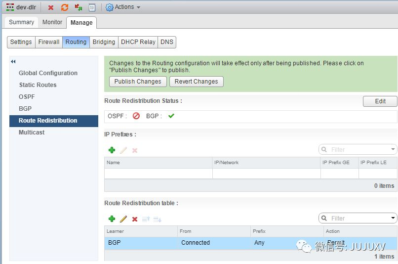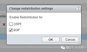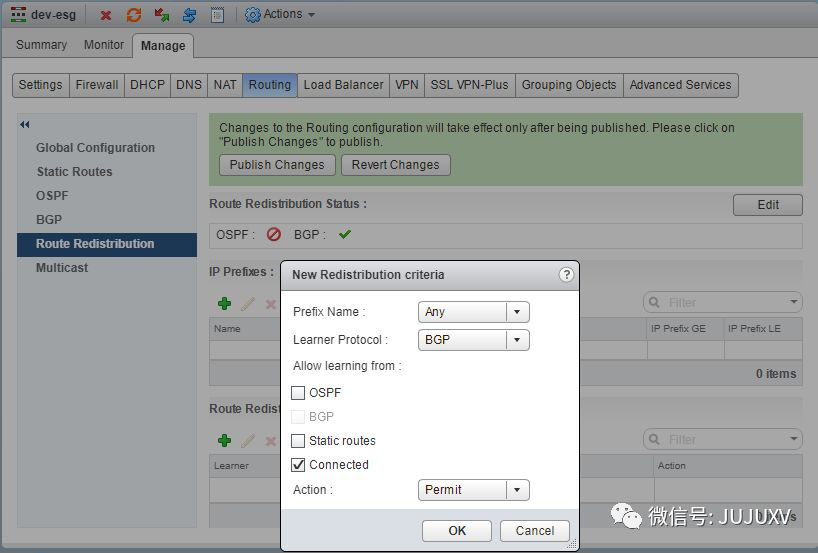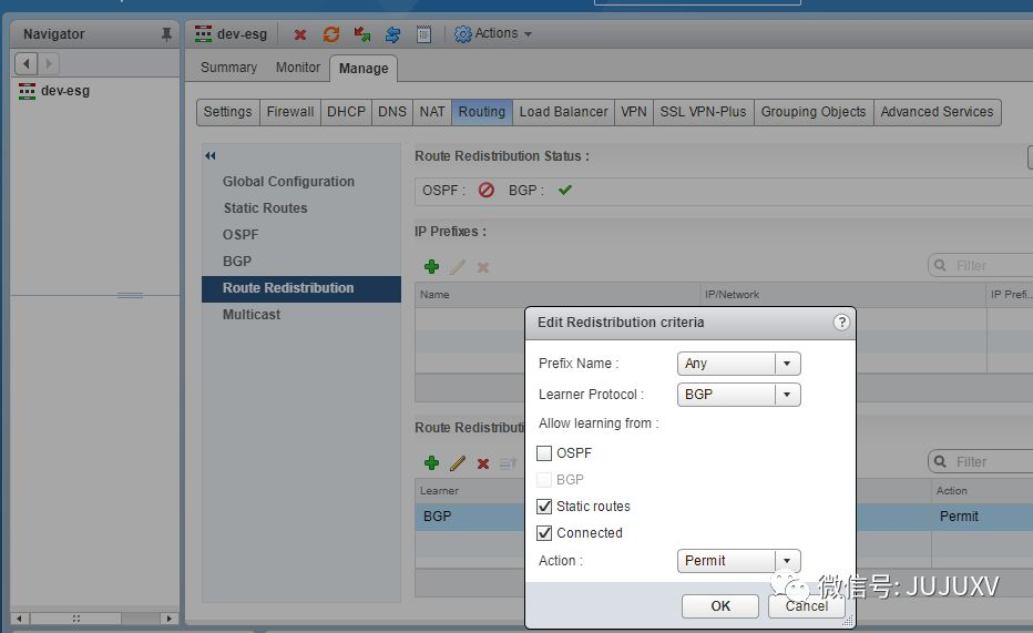 此时,在dev-esg的路由重分发设置下,勾选Static routes,将静态路由条目重分发给BGP邻居