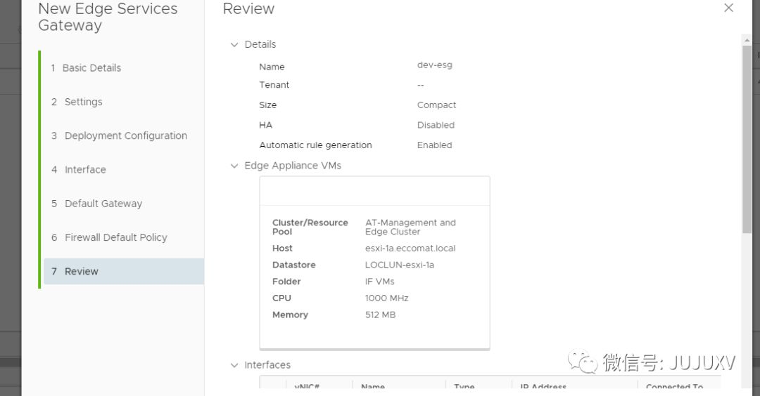 确认各项参数设置无误后,退出向导;NSX Manager将通过vCenter的EAM,在esxi-1a这台服务器上创建一台dev-esg虚拟机