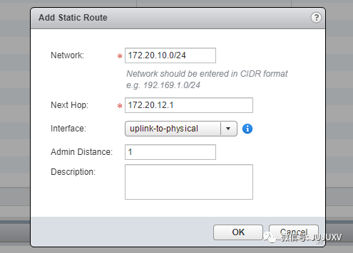 新建一条10.0.10.0/24网络的静态路由,NH=172.20.12.100,这是将来ESG边界服务网关的上联地址