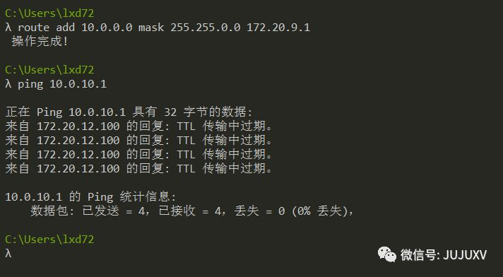 由于JUMP主机是我的台式机,只配置了一个172.20.9.150/24的地址,并没有配置网关,因此需要在命令行通过route add命令添加一条静态路由;