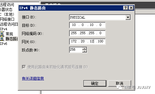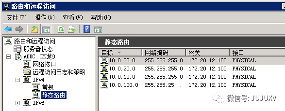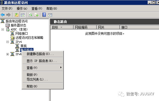 在ADDC虚拟机的“路由和远程访问”界面,新建IPv4静态路由