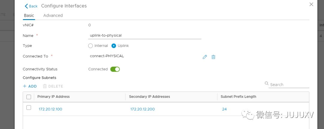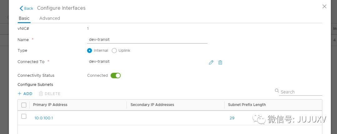 与创建DLR-Instance实例一样,我们需要为dev-esg配置上联接口和内部接口: