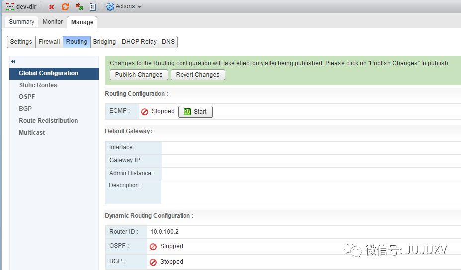 事实上,DLR-CVM会告知dev-esg的路由条目是10.0.10.0/24 NH=10.0.100.2,会用自己的转发地址替换协议地址。