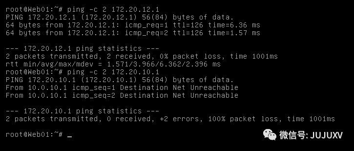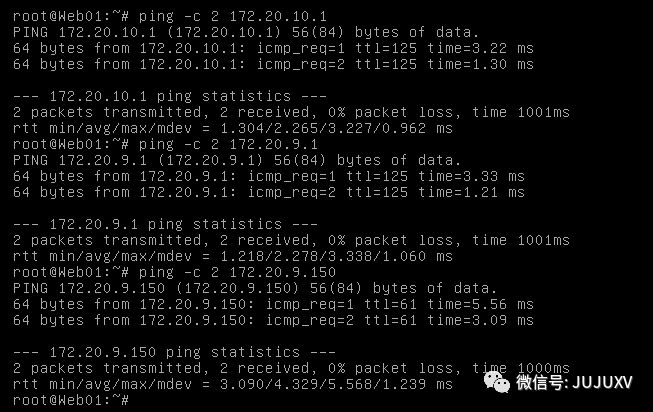 访问Web01的命令行,可以看到除了172.20.10.0/24网络以外,Web01已经可以正常访问JUMP主机地址,即172.20.9.150