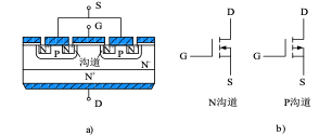☞按垂直导电结构的差异,分为利用 V型槽实现垂直导电的VVMOSFET (Vertical V-groove MOSFET)和具有垂直导电双扩散MOS结构的DMOSFET(Vertical Double-diffused MOSFET)。