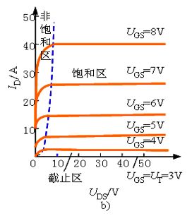 √截止区(对应于GTR的截止区)、饱和区(对应于GTR的放大区)、非饱和区(对应于GTR的饱和区)三个区域,饱和是指漏源电压增加时漏极电流不再增加,非饱和是指漏源电压增加时漏极电流相应增加。