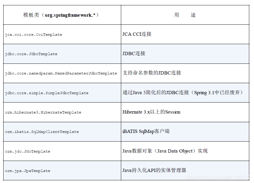针对不同的持久化平台,Spring提供了多个可选的模板。