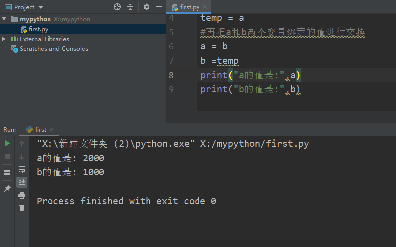 思考:已知有两个变量,a变量的值为1000,b变量的值为2000,问在不创建新对象的情况下,如何让变量a和变量b的值进行交换(交叉绑定)?这里我们先借助第三个变量(临时变量,让它随意绑定一个(a,b任意)变量的值,再进行交换。代码如下: