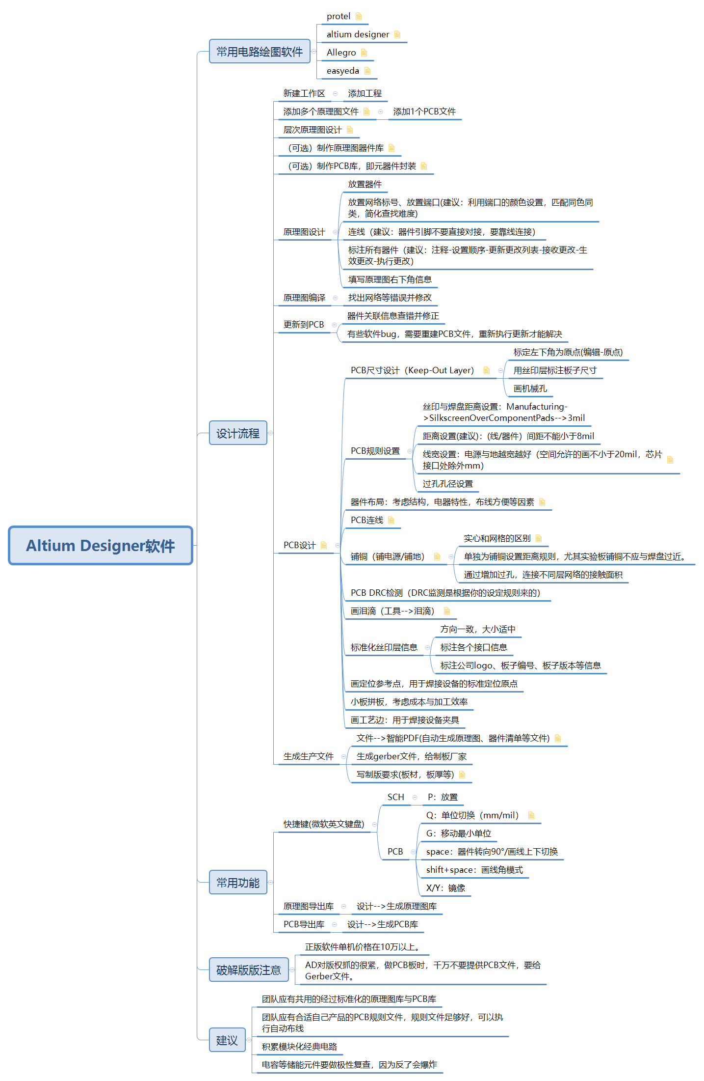 文章是我给新员工培训时的脑图提纲,并不适合零基础的小白,而是适合掌握基本AD操作技能的小灰(有部分基础的小白),哈哈。所以文章中并没有表明AD的具体操作步骤,因为这需要占用太长的篇幅,且资料超多没有意义,本文的意义在于教会小灰正确的设计流程以及多人协作的方式。