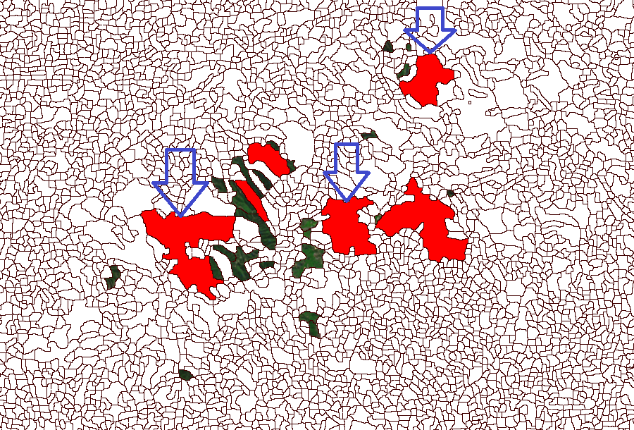 - 如果我们将样本数据做为验证数据(实际上验证数据可以包含但不仅限于样本数据)。可以看出,图18中三块蓝箭头标记的对象在相似系数0.997(图17)时没有入选,分类精度不到50%。