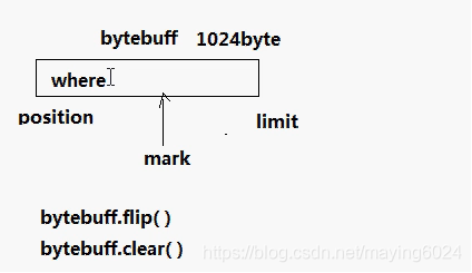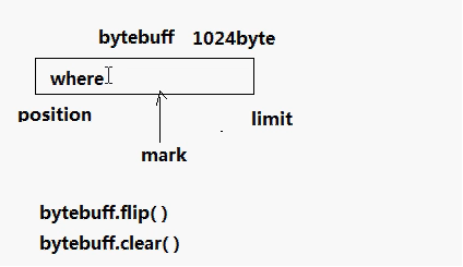 当从客户端读取数据时,会先执行bytebuff.clear(),所以position指向0,limit直接结尾,mark也指向0,读取数据where到bytebuff时,mark指向了4,执行flip之后,limit指向mark指向的位置,position到limit中间的数据就是这次读取进来的数据。所以flip方法所做的操作就是把positon指向本次数据的起始点,把limit指向本次数据的结束点。Clear方法是把position指针指向缓存区的起始点,把limit指针指向本次数据的结束点。