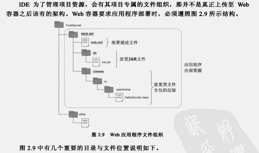 - WEB-INF:这个目录名称是固定的,而且一定是位于应用程序根目录下。放置在WEB-INF中的文件或目录,对外界来说是封闭的,也就是客户端无法用HTTP的任何方式直接访问到WEB-INF中的文件或目录。若有这类需要,则必须通过Servlet/JSP的请求转发。不想让外界存取的资源,可以放置在这个目录下。